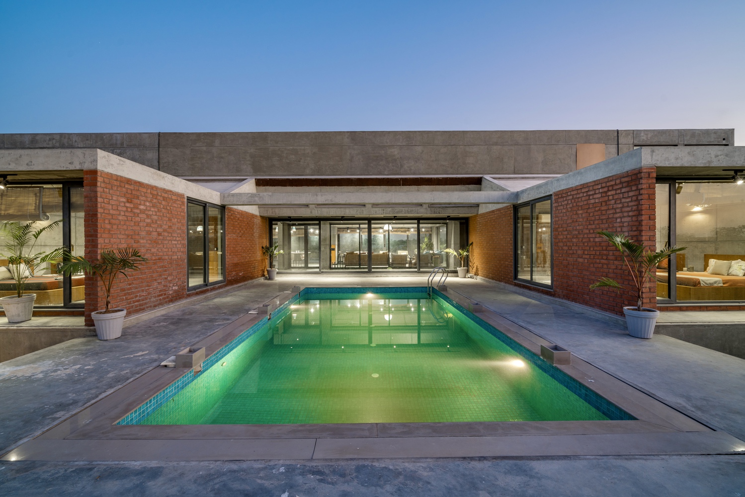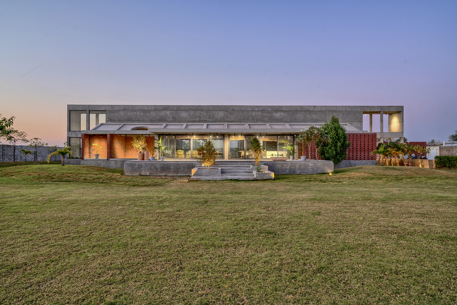 雙灣之家采用清水混凝土澆筑而成,從內(nèi)至外均采用清水混凝土做舊效果設(shè)計。建筑由南至北向兩端延伸空間,建筑與周圍的自然田園默契的相互融合。無論是黑夜或者白天雙彎之家給人們帶來一種神密之所在。