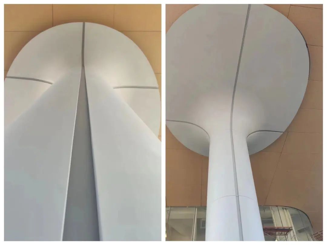 得益于UHPC優(yōu)異的材料屬性,能制作大規(guī)格及大異型的預(yù)制構(gòu)件,為建筑幕墻裝飾行業(yè)帶來了更多的可行性。完工后的柱體造型流暢,美觀獨特,現(xiàn)代輕奢。窄橫縫、寬豎縫的建筑成品更給人視覺上”無橫縫“的效果。UHPC表面質(zhì)地細(xì)膩,讓其融入水景,與水面景觀相輔相成,互相促進。