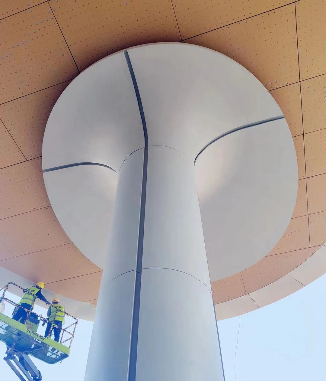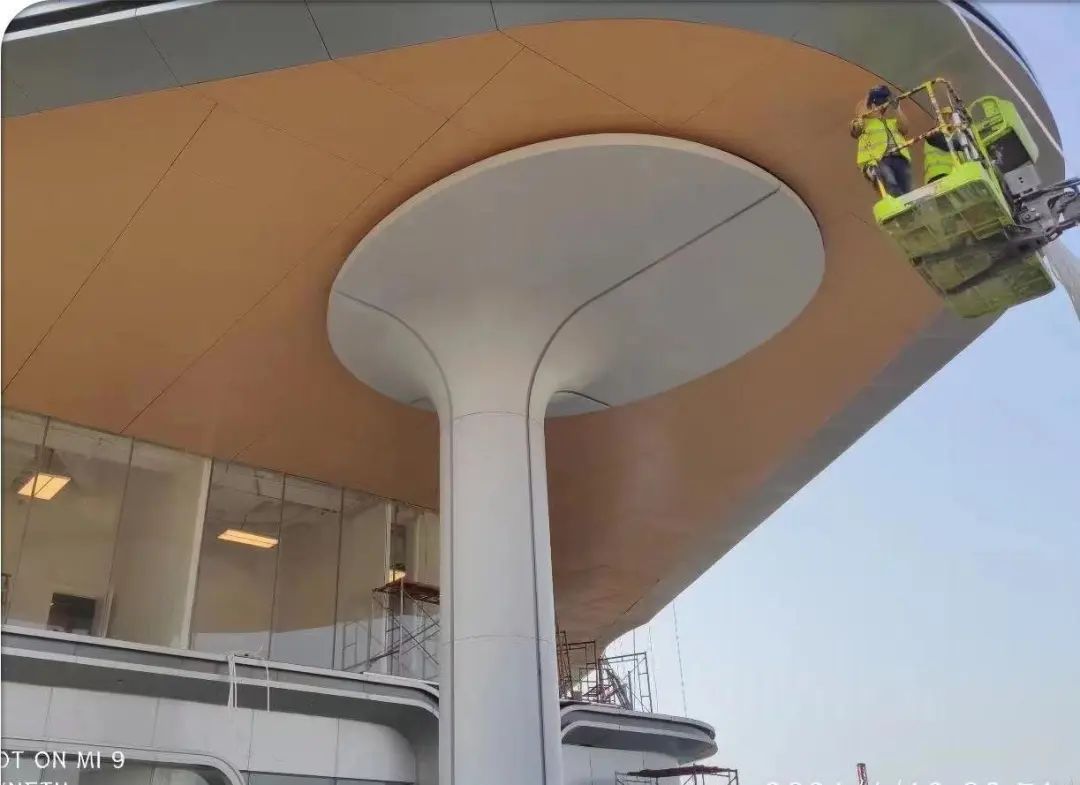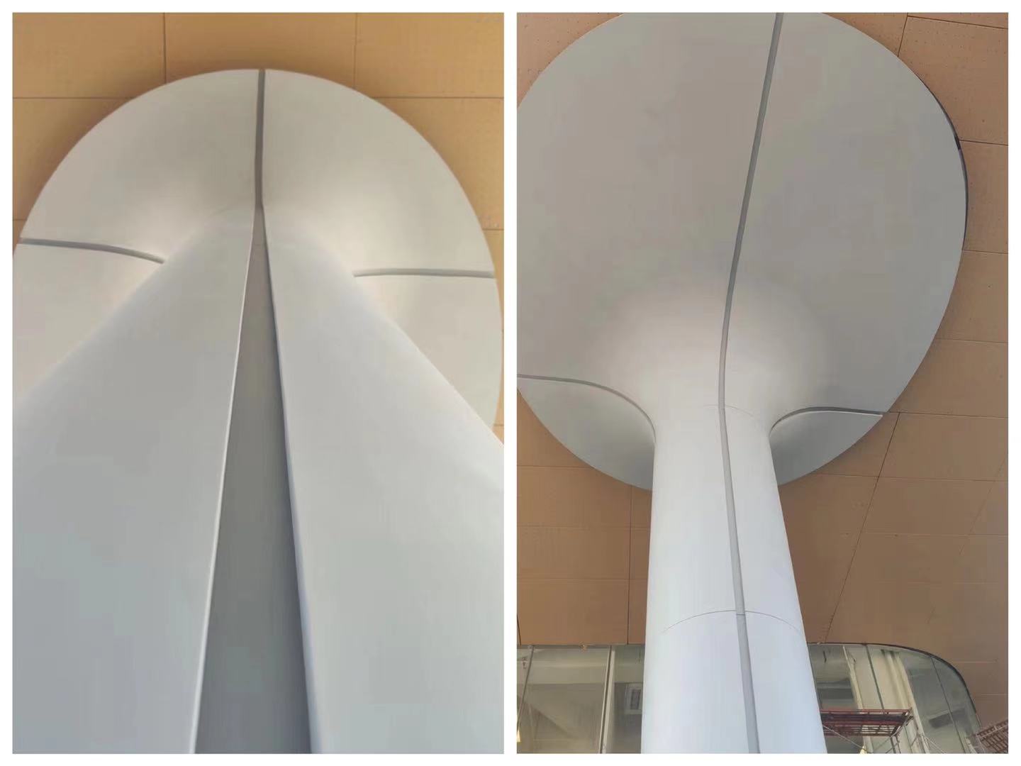 得益于UHPC優(yōu)異的材料屬性,能制作大規(guī)格及大異型的預(yù)制構(gòu)件,為建筑幕墻裝飾行業(yè)帶來了更多的可行性。完工后的柱體造型流暢,美觀獨特,現(xiàn)代輕奢。窄橫縫、寬豎縫的建筑成品更給人視覺上”無橫縫“的效果。UHPC表面質(zhì)地細膩,讓其融入水景,與水面景觀相輔相成,互相促進。