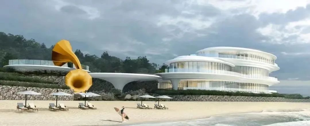 心形的淡水湖,無(wú)邊的泳池,銀河的步道,如藝術(shù)品般的建筑融入海島之上。建筑創(chuàng)作靈感來(lái)自于廣闊的大海,以海洋和音樂元素的變換演藝,通過藝術(shù)化的方式呈現(xiàn)出音樂的固態(tài)形式,表達(dá)生活的多樣性和藝術(shù)性。
