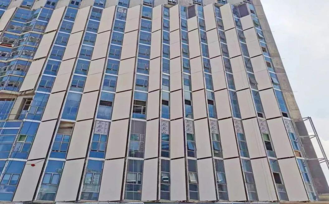 該項目采用米白色噴砂效果的拉法基UHPC幕墻掛板,厚度為25MM。拉法基UHPC幕墻板與玻璃幕墻波浪形式的組合,形如潮涌,讓整個建筑仿佛在不斷的流動之中,再加上垂直綠化花園景觀立面,打造溫馨氛圍,為入住患者提供情緒上的舒適感。