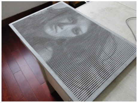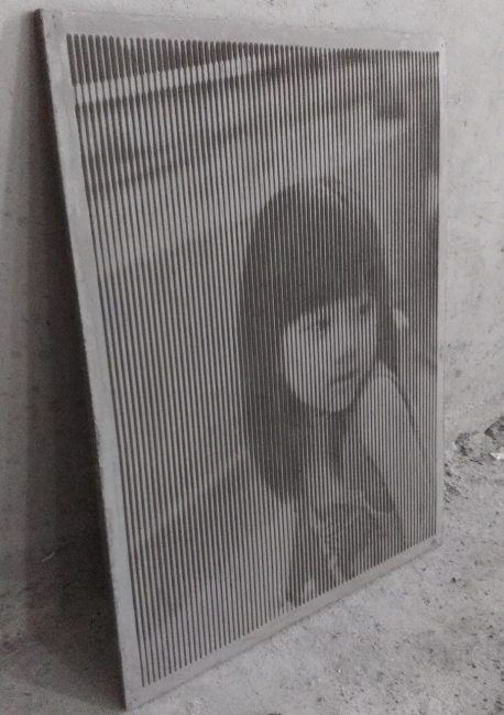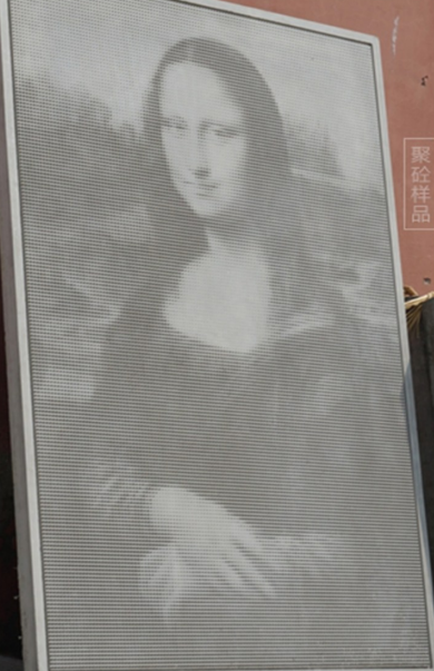 原理:將圖片轉(zhuǎn)化成灰度圖,再用專門軟件處理成CNC雕刻指令,在木板上打點(diǎn)或刻槽制作成母模,再用模具轉(zhuǎn)印到混凝土表面形成圖案。由在光照條件下凹槽或凹點(diǎn)內(nèi)的寬窄不同、深淺不一的陰影與基板顏色共同形成表面圖像,隨著光線角度不同和觀察角度不同,圖案呈現(xiàn)動態(tài)效果。