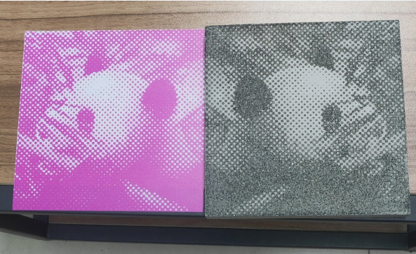 原理:將圖片處理后使用印刷設備印刷到 防水紙或膜上,其中印刷油墨中包含特殊的水泥緩凝劑,制成緩凝成像膜。再使用緩凝成像膜制作混凝土板,使得混凝土板上圖案區(qū)域骨料露出,與無圖案部分的水泥基色形成對比,產(chǎn)生圖案效果。圖案由圖案部分露出的骨料與無圖案部分正常水泥石的顏色色差對比形成。緩凝成像技術制成的圖像混凝土,圖案從任意角度觀察都清晰可見。